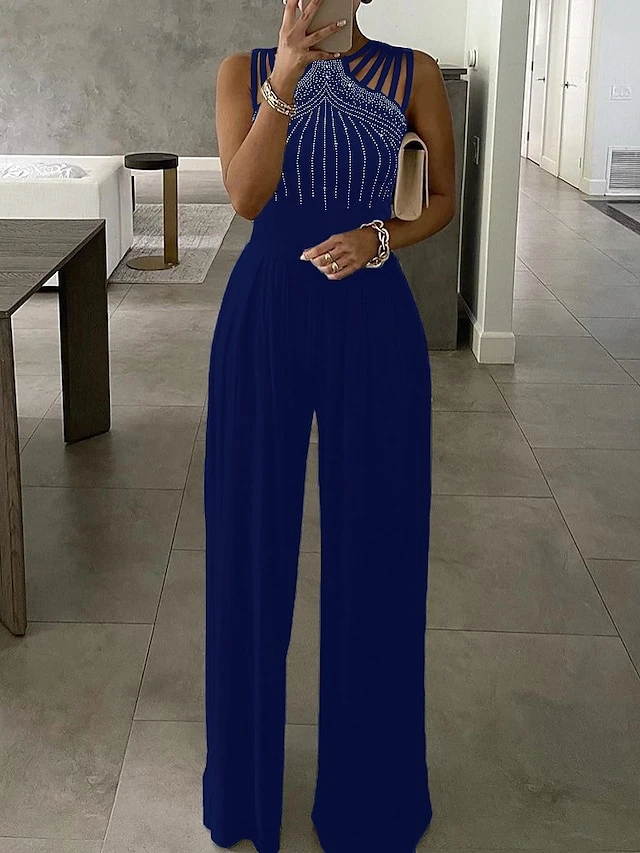 Jumpsuits For Women Dressy Beaded Solid Color Sequin Crew Neck Elegant Xmas Party Evening Christmas Prom Wide Leg Regular Fit Sleeveless Blue Black Wine S M LFall Summer