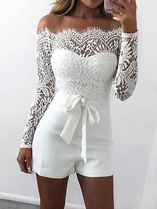 White Jumpsuit For Women Sexy Romper Lace Backless Solid Color Off Shoulder Elegant Party Street Regular Fit Long Sleeve S M L Summer