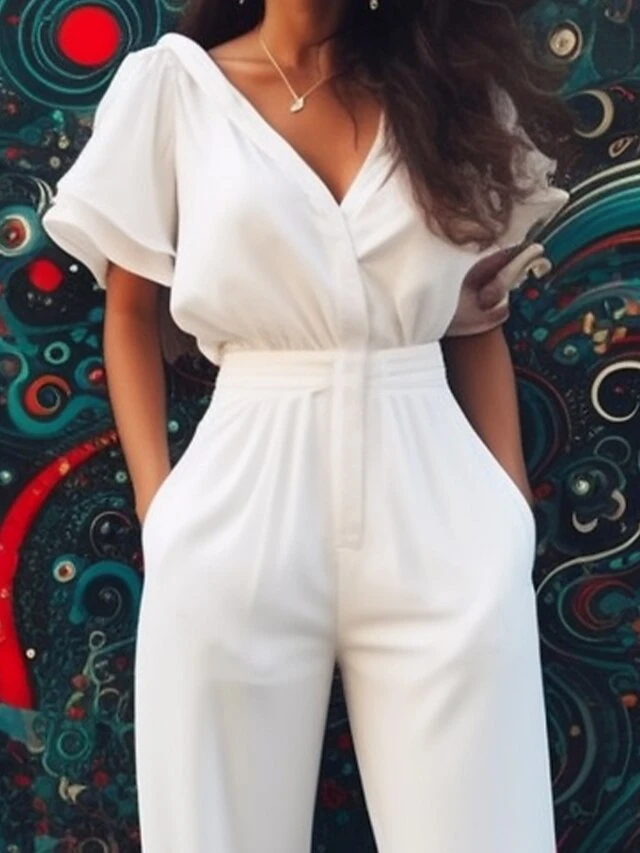 White Jumpsuit For Women Zipper Solid Color Patch Pocket V Neck Ordinary Party Daily Straight Regular Fit Half Sleeve Bell Sleeve Black Royal Blue S M L Summer
