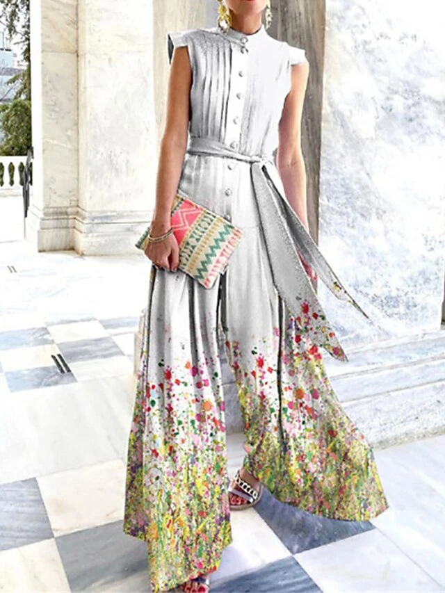 Women Party Jumpsuit Print Floral One Shoulder Ordinary Daily Wear Regular Fit Sleeveless Blue White Purple S M L Spring Fall(The Printing Position Is Not Fixed)
