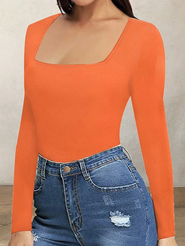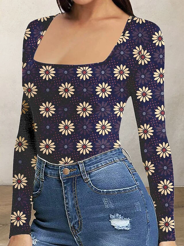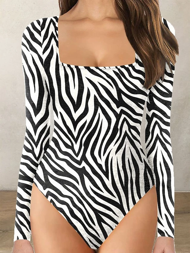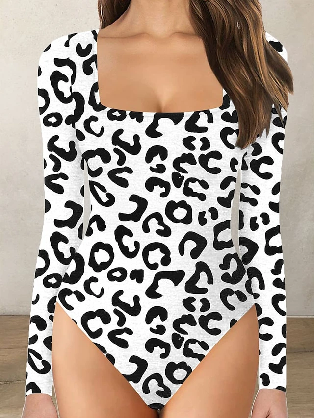 Women’s Bodysuit Print Leopard Square Neck Active Daily Holiday Regular Fit Long Sleeve Picture Color 1 Picture Color 2 Picture Color 3 S M L Fall