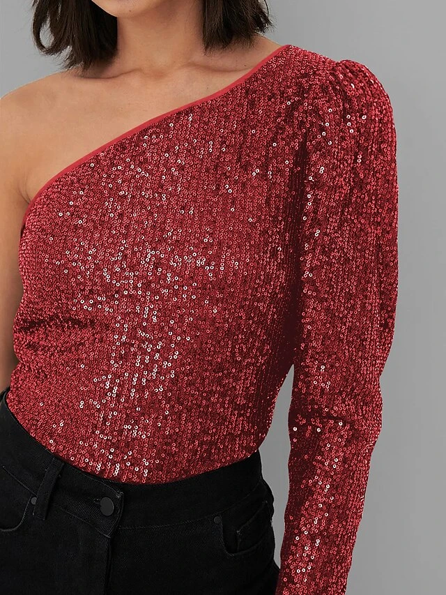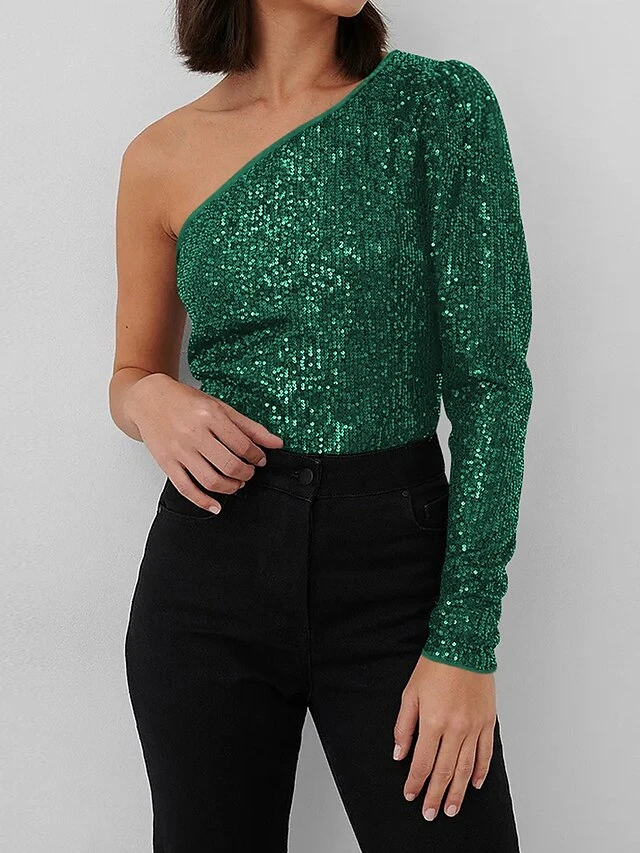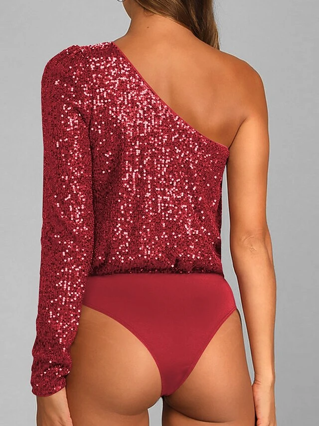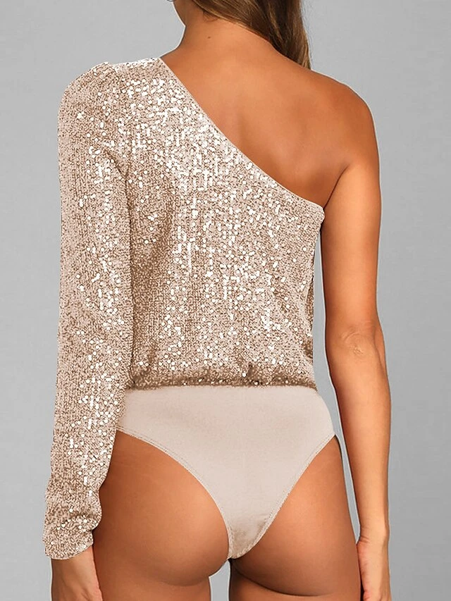 Women’s Bodysuit Sequin Solid Color One Shoulder Streetwear Party Street Slim Long Sleeve Black White Pink S M L Fall