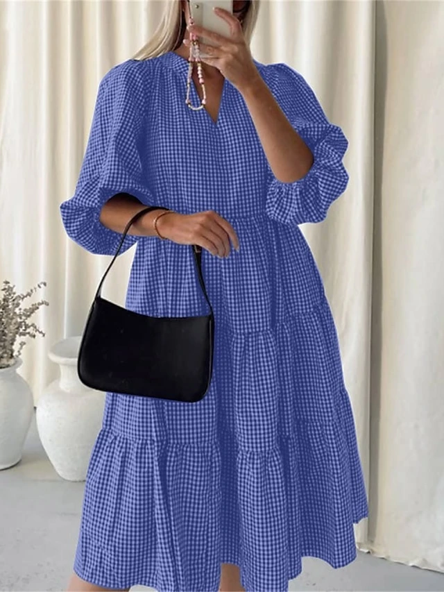 Women’s Casual Dress Cotton Dress Midi Dress Cotton Basic Classic Outdoor Daily Vacation V Neck Print Long Sleeve Spring Fall Winter 2023 Loose Fit Black Yellow Red Plaid S M L XL 2XL