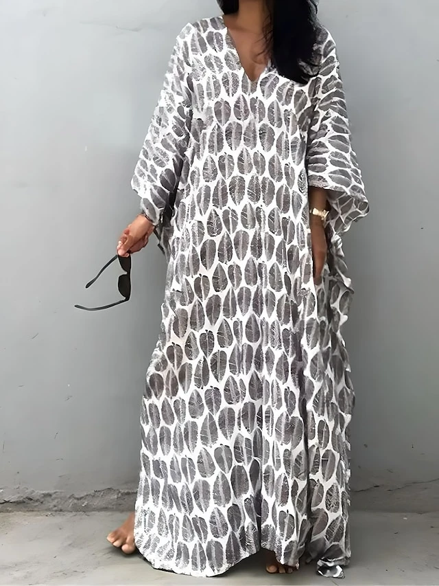 Women’s Casual Dress Cotton Linen Dress A Line Dress Maxi Long Dress Polyester Fashion Casual Outdoor Daily Vacation V Neck Print 3/4 Length Sleeve Spring Fall Winter 2023 Loose Fit White Leaf
