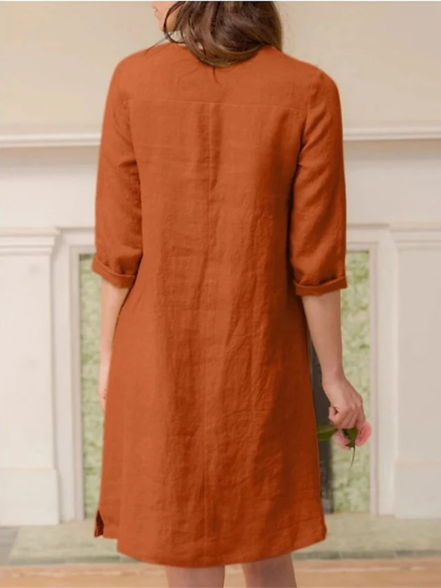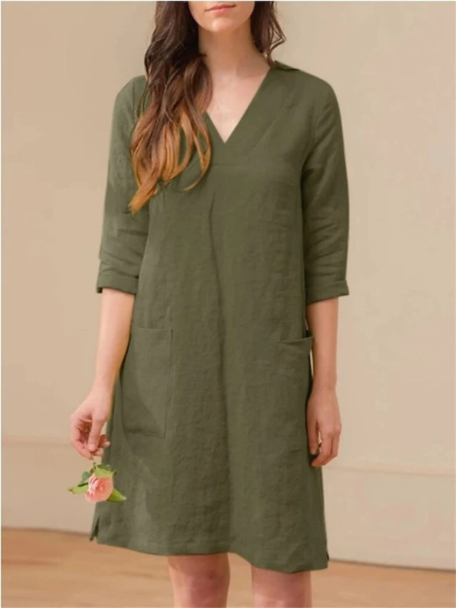 Women’s Casual Dress Cotton Linen Dress A Line Dress Midi Dress Cotton Blend Basic Casual Outdoor Daily V Neck Pocket 3/4 Length Sleeve Summer Spring Fall 2023 Loose Fit ArmyGreen Navy Blue Orange
