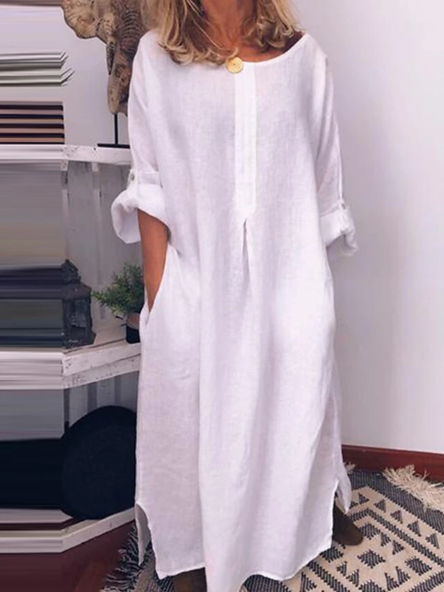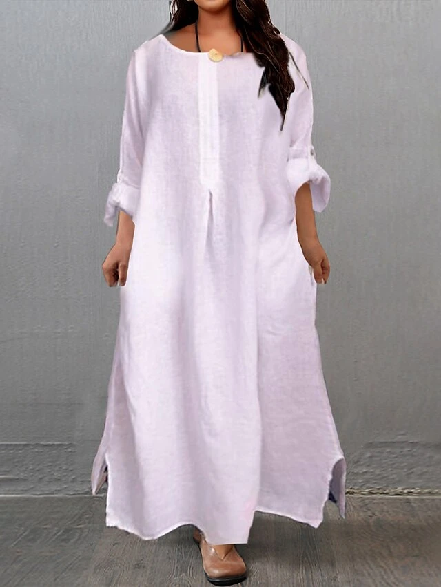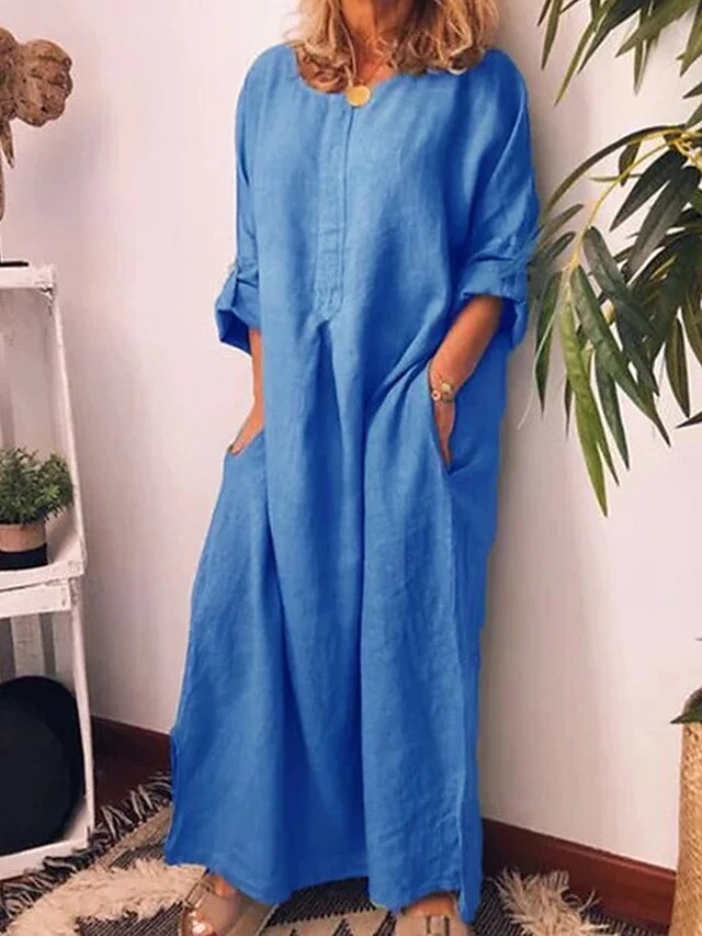 Women’s Casual Dress Cotton Linen Dress Black Dress Maxi Long Dress Linen / Cotton Blend Fashion Daily Outdoor Daily Vacation Crew Neck Button Pocket 3/4 Length Sleeve Fall Autumn 2023 Loose Fit