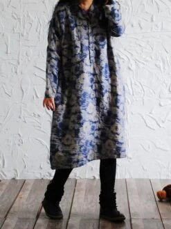 Women’s Casual Dress Cotton Linen Dress Loose Dress Midi Dress Cotton Blend Daily Stylish Outdoor Daily Vacation V Neck Button Print Long Sleeve Spring Fall Winter 2023 Loose Fit Red Blue Green Floral