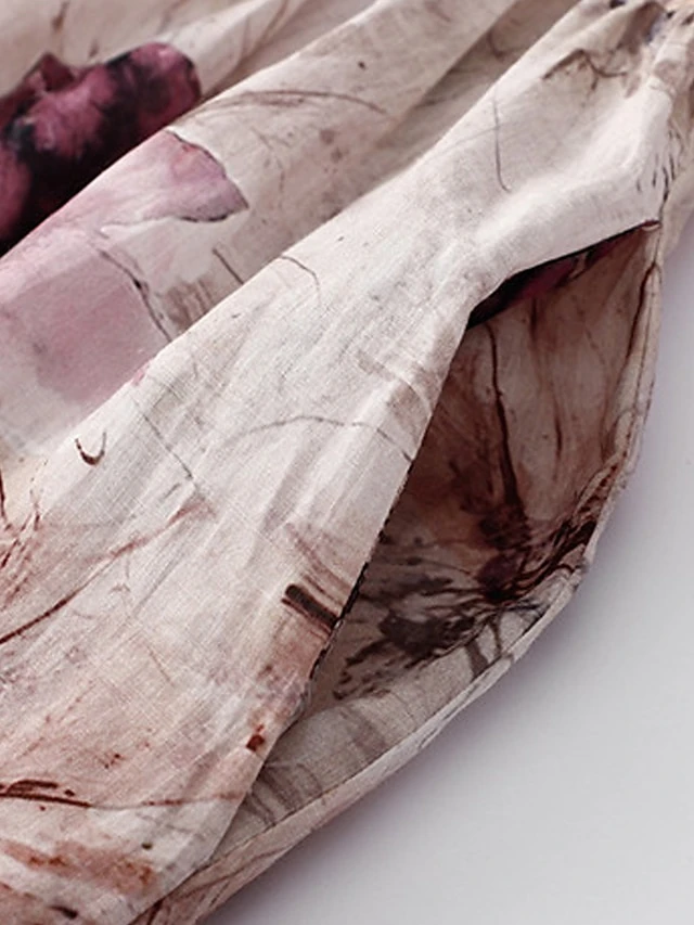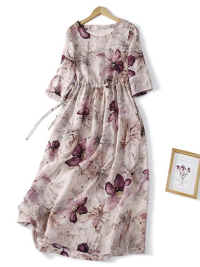 Women’s Casual Dress Cotton Linen Dress Midi Dress Cotton Fashion Casual Outdoor Daily Vacation Crew Neck Pocket Print 3/4 Length Sleeve Spring Fall Autumn 2023 Loose Fit Pink Floral M L XL 2XL