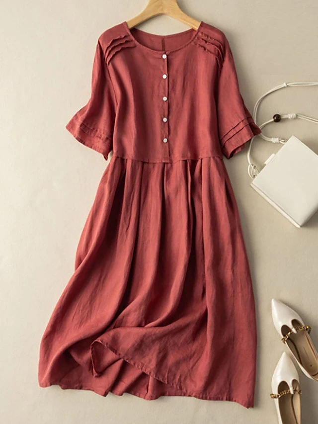 Women’s Casual Dress Cotton Linen Dress Midi Dress Linen / Cotton Blend Fashion Classic Style Outdoor Daily Holiday Crew Neck Button Short Sleeve Fall Winter Autumn 2023 Loose Fit Pink Wine Green