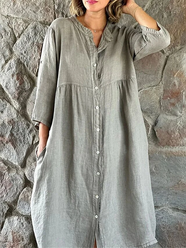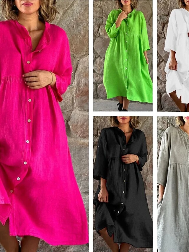 Women’s Casual Dress Cotton Linen Dress Swing Dress Midi Dress Cotton Blend Basic Classic Outdoor Daily Vacation Stand Collar Button Pocket 3/4 Length Sleeve Summer Spring Autumn 2023 Loose Fit Black