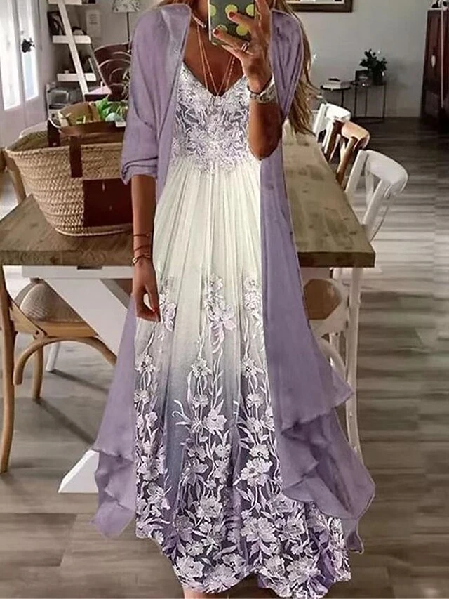 Women’s Casual Dress Dress Set Two Piece Dress Long Dress Maxi Dress Light Green Pink Purple Long Sleeve Flower Print Summer Spring V Neck Fashion Loose Fit 2023 S M L XL XXL 3XL