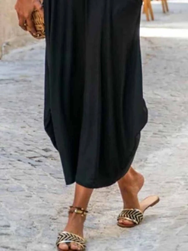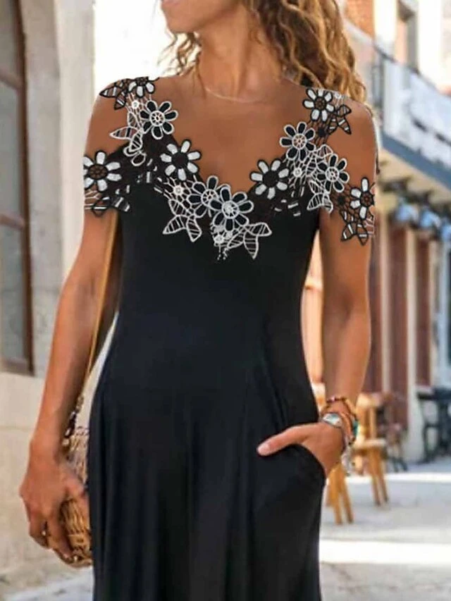Women’s Casual Dress Lace Dress Black Dress Long Dress Maxi Dress Polyester Fashion Casual Daily Vacation Going Out Strap Lace Patchwork Short Sleeve Summer Spring 2023 Loose Fit Black Plain S M L XL
