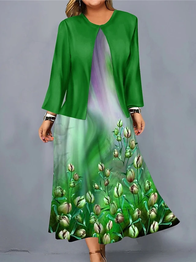 Women’s Christmas Plus Size Curve Casual Dress Dress Set Two Piece Dress Floral Midi Dress Long Sleeve Print Crew Neck Fashion Outdoor Wine Blue Fall Winter L XL XXL 3XL 4XL