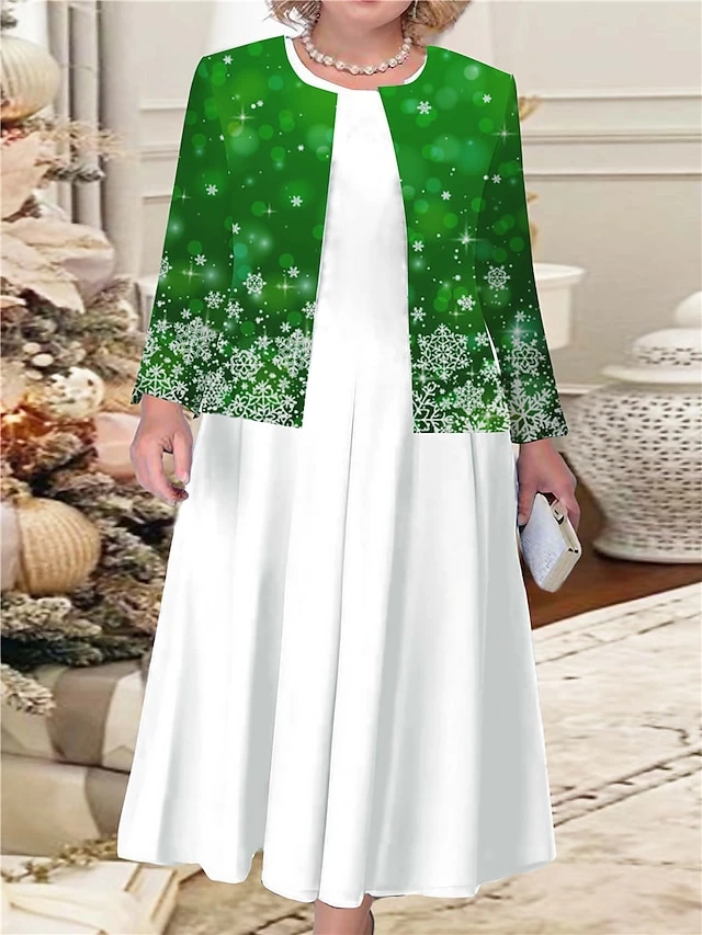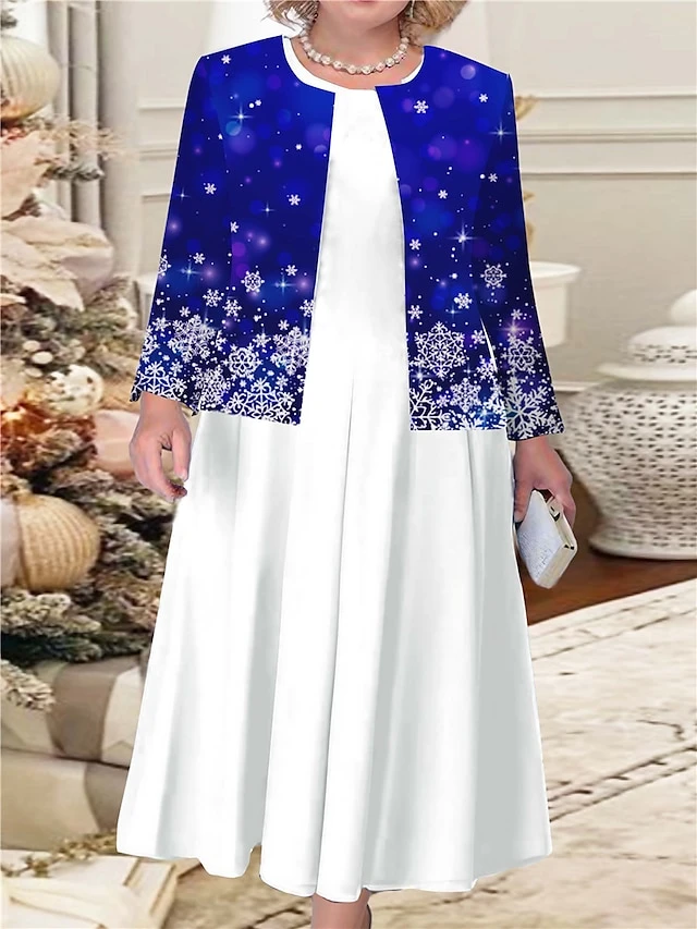 Women’s Christmas Plus Size Curve Casual Dress Dress Set Two Piece Dress Snowflake Midi Dress Long Sleeve Print Crew Neck Fashion Outdoor Red Blue Fall Winter L XL XXL 3XL 4XL