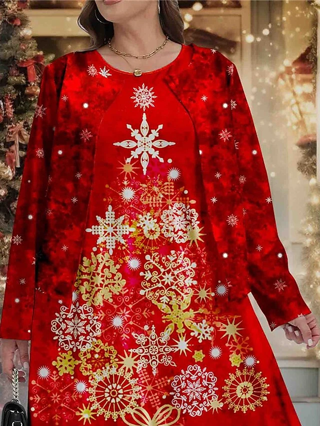 Women’s Christmas Plus Size Curve Casual Dress Dress Set Two Piece Dress Snowflake Midi Dress Long Sleeve Print Crew Neck Fashion Outdoor Wine Fall Winter L XL XXL 3XL 4XL