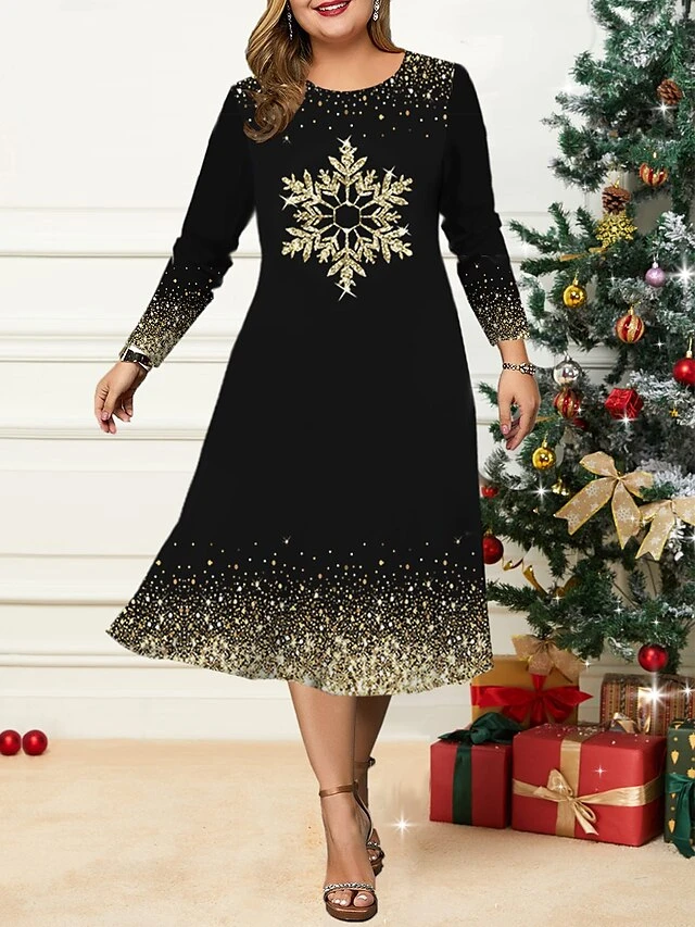 Women’s Christmas Plus Size Curve Casual Dress Skater Dress A Line Dress Christmas Tree Snowflake Midi Dress Long Sleeve Print Crew Neck Fashion Outdoor Black Red Fall Winter L XL XXL 3XL 4XL