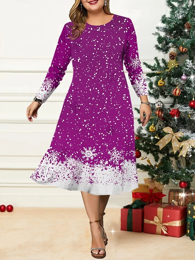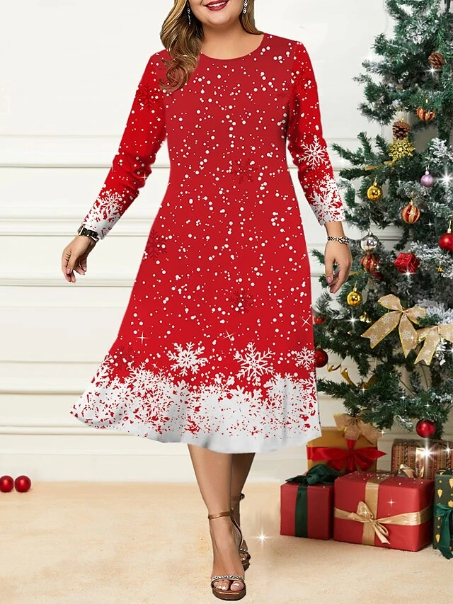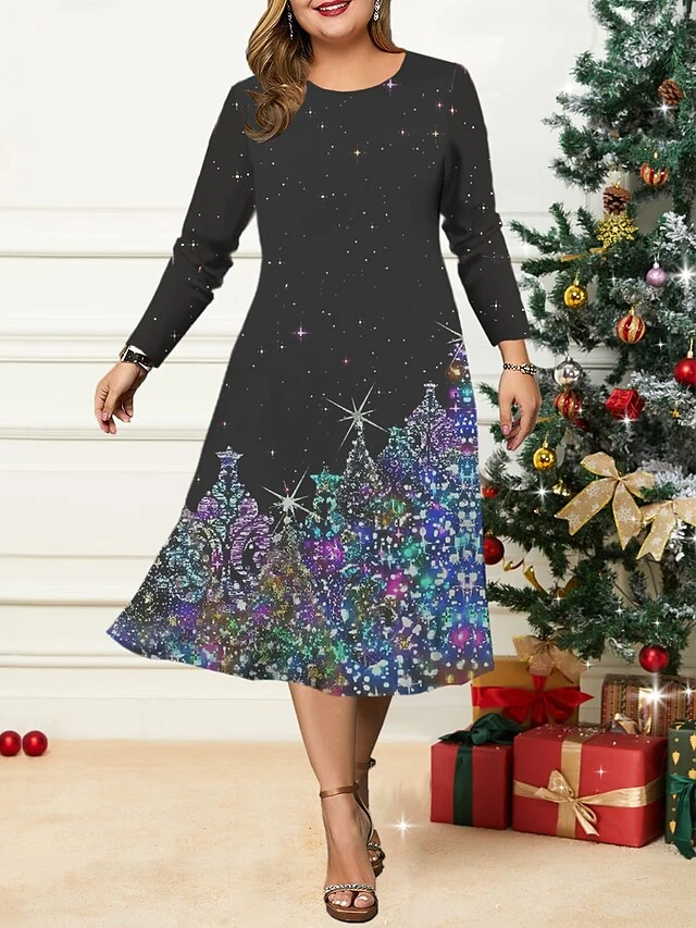 Women’s Christmas Plus Size Curve Casual Dress Skater Dress A Line Dress Christmas Tree Snowflake Midi Dress Long Sleeve Print Crew Neck Fashion Outdoor Black Wine Fall Winter L XL XXL 3XL 4XL