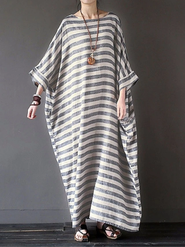 Women’s Cotton Linen Dress Casual Dress Maxi Long Dress Linen Cotton Blend Casual Outdoor Daily Crew Neck Print Long Sleeve Summer Spring Fall 2023 Loose Fit Black Gray Striped S M L XL 2XL