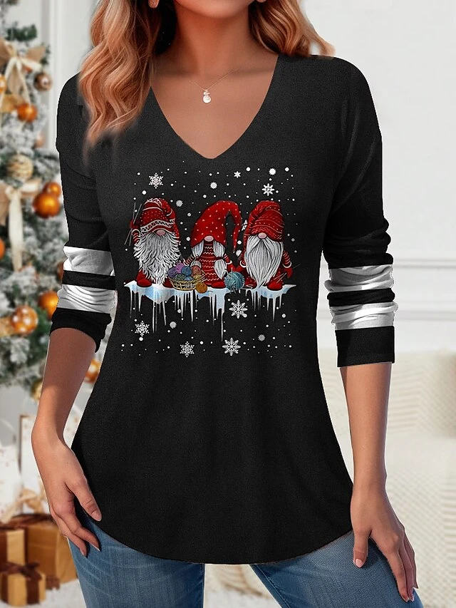 Women’s Designer Shirt Christmas Shirt Black Red Green Santa’s Helper Print Long Sleeve Party Christmas Weekend Festival / Holiday V Neck Regular Fit Painting Spring &Fall
