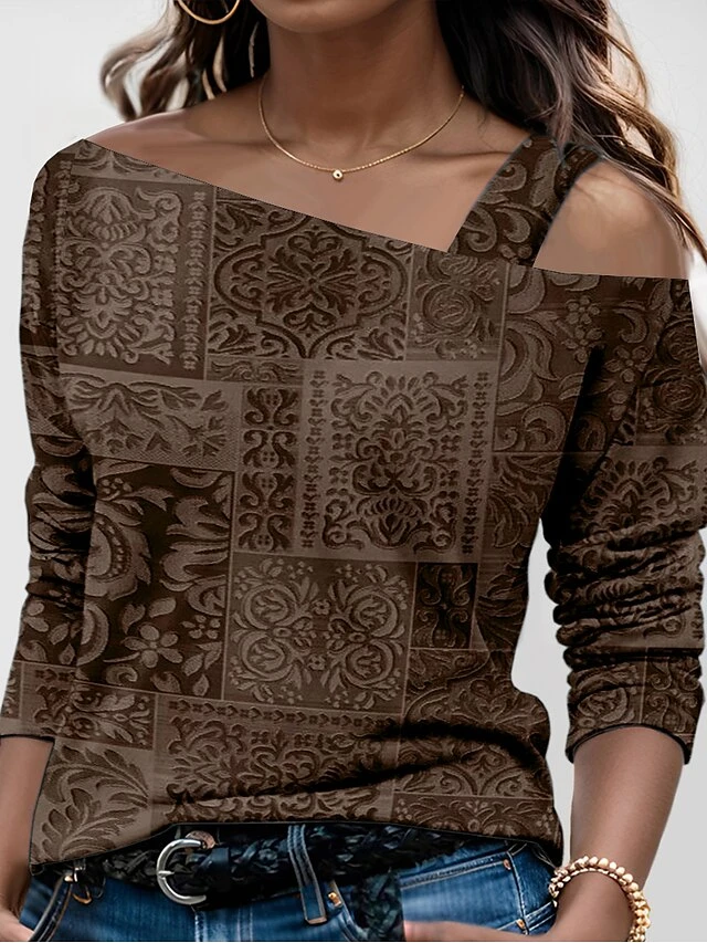 Women’s Designer Shirt Red Blue Brown Graphic Print Long Sleeve Daily Weekend Fashion Diagonal Neck Regular Fit Painting Spring &Fall