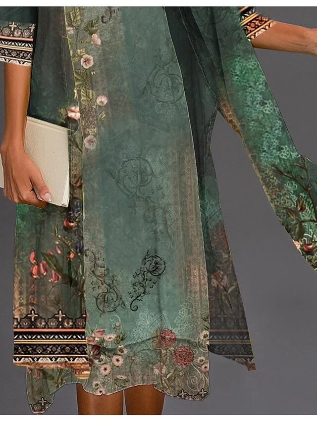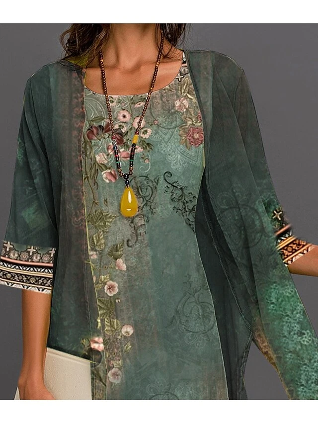 Women’s Dress Set Two Piece Dress Emerald Green Dress Midi Dress Green 3/4 Length Sleeve Floral Print Winter Fall Spring U Neck Fashion Daily 2023 S M L XL 2XL 3XL