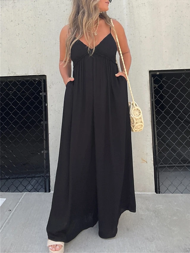 Women’s Jumpsuit Backless Solid Color V Neck Streetwear Street Daily Regular Fit Strap Black S M L Spring