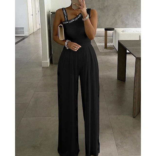 Women’s Jumpsuit Beaded Solid Color V Neck Elegant Daily Holiday Straight Regular Fit Sleeveless Black S M L Spring