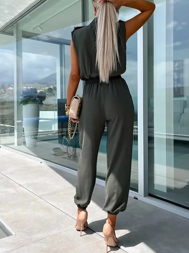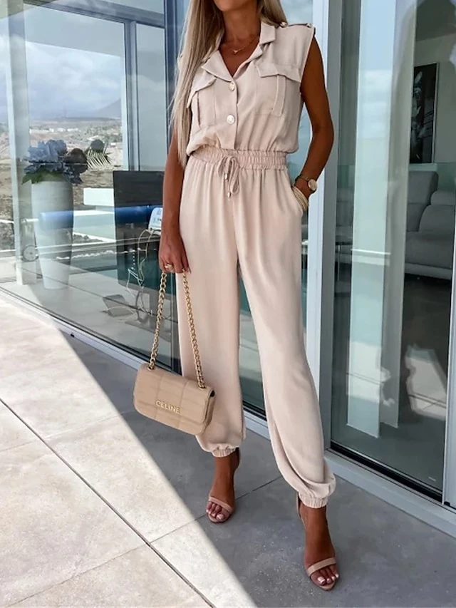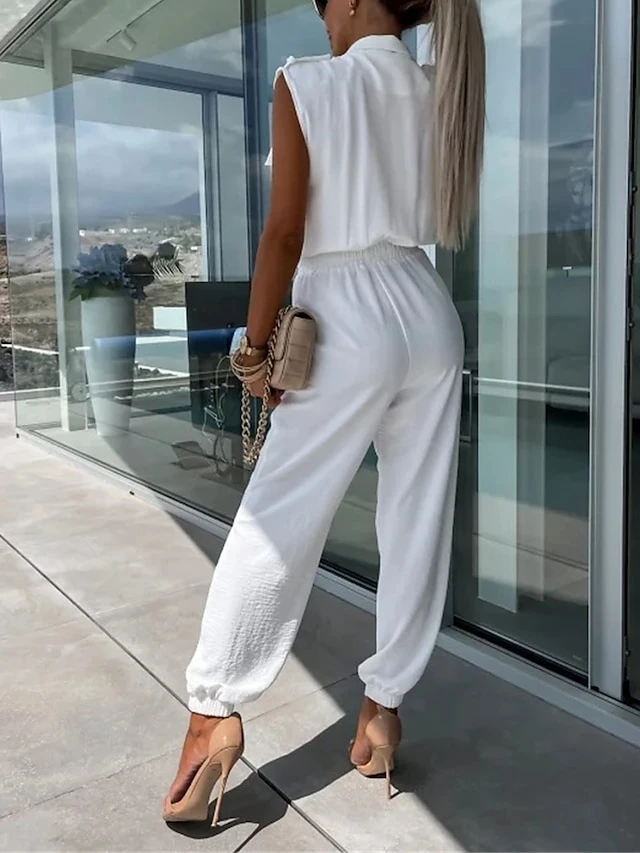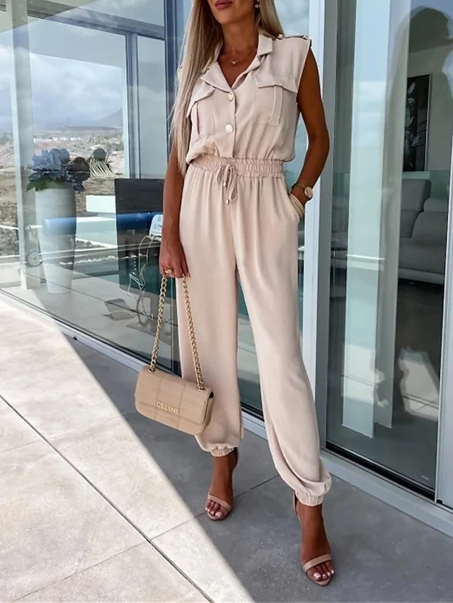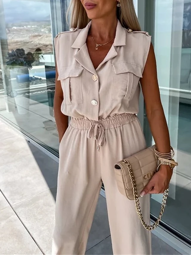 Women’s Jumpsuit Button Pocket Solid Color Shirt Collar Streetwear Street Daily Regular Fit Short Sleeve Black White Green S M L Summer