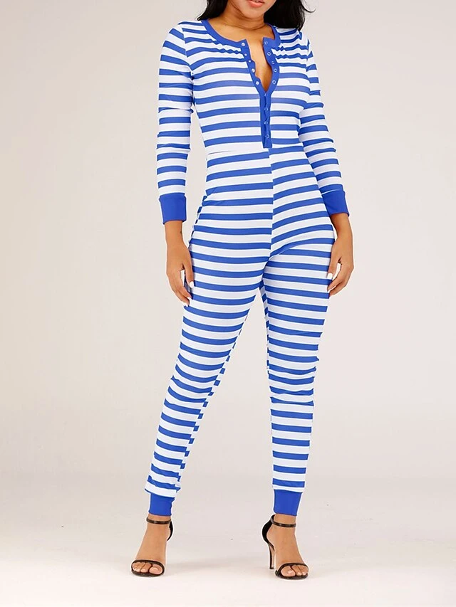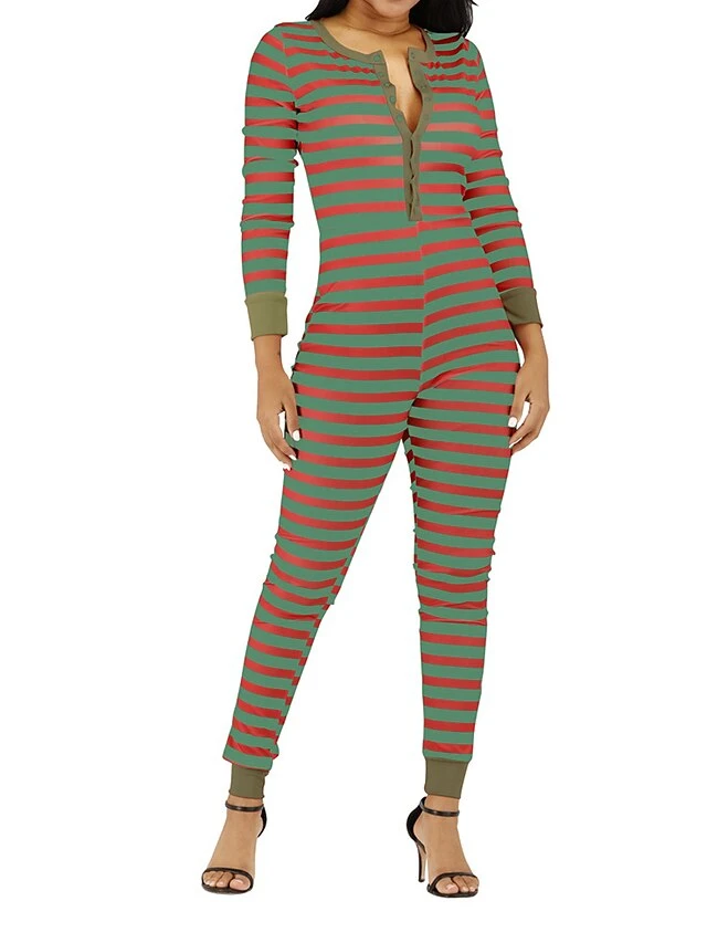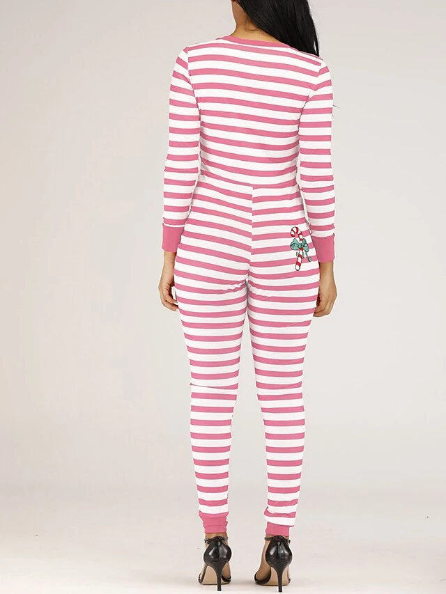 Women’s Jumpsuit Button Print Striped V Neck Streetwear Christmas Street Xmas Regular Fit Long Sleeve Pink Red Blue S M L Fall