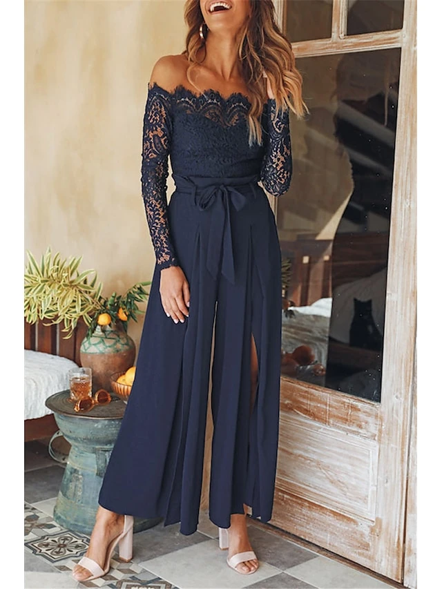 Women’s Jumpsuit For Special Occasions Lace Backless Solid Color Off Shoulder Streetwear Going Out Bar Regular Fit Long Sleeve Navy Blue S M L Winter