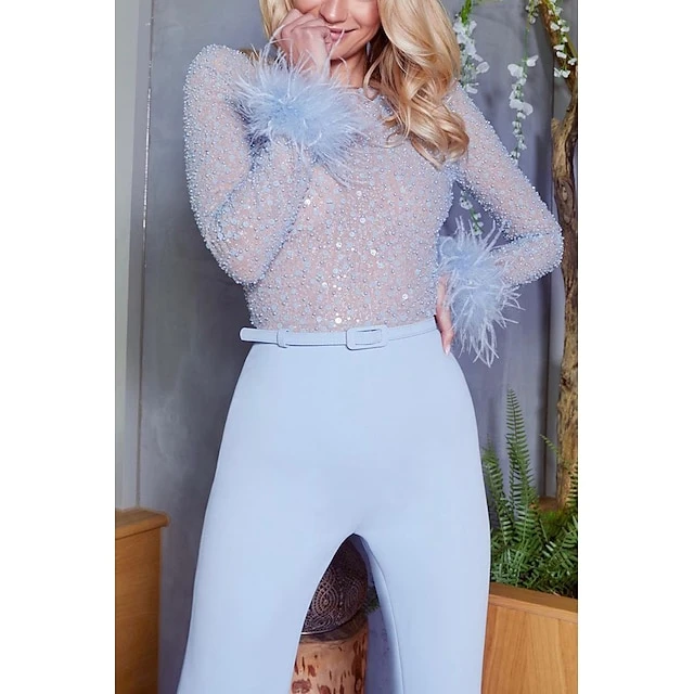 Women’s Jumpsuit For Special Occasions Party Solid Color Feather Patchwork Wide Leg Long Sleeve Cocktail Fall