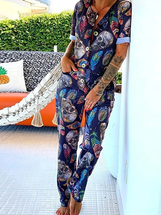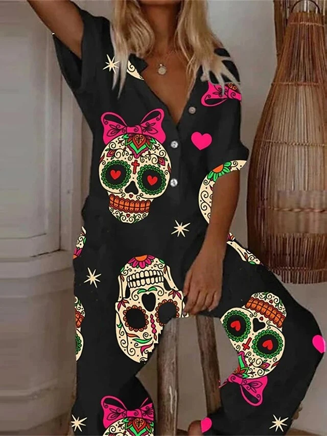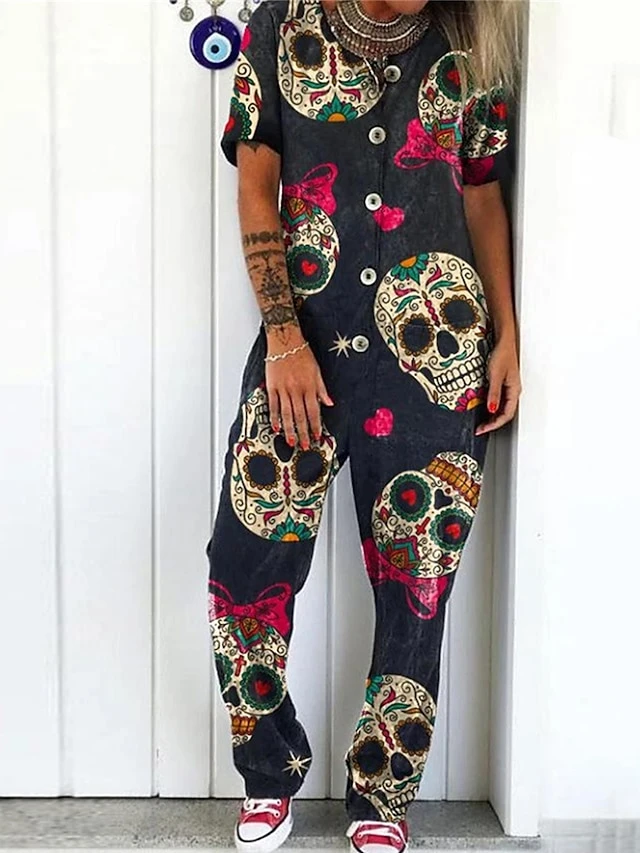 Women’s Jumpsuit Halloween Skeleton Button Pocket Print V Neck Streetwear Street Daily Regular Fit Short Sleeve Black White Blue S M L Summer