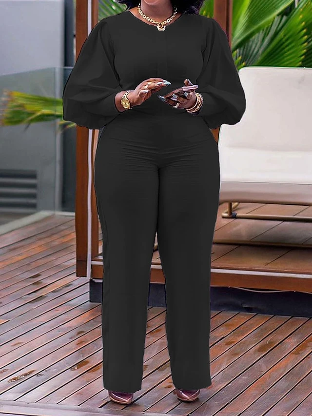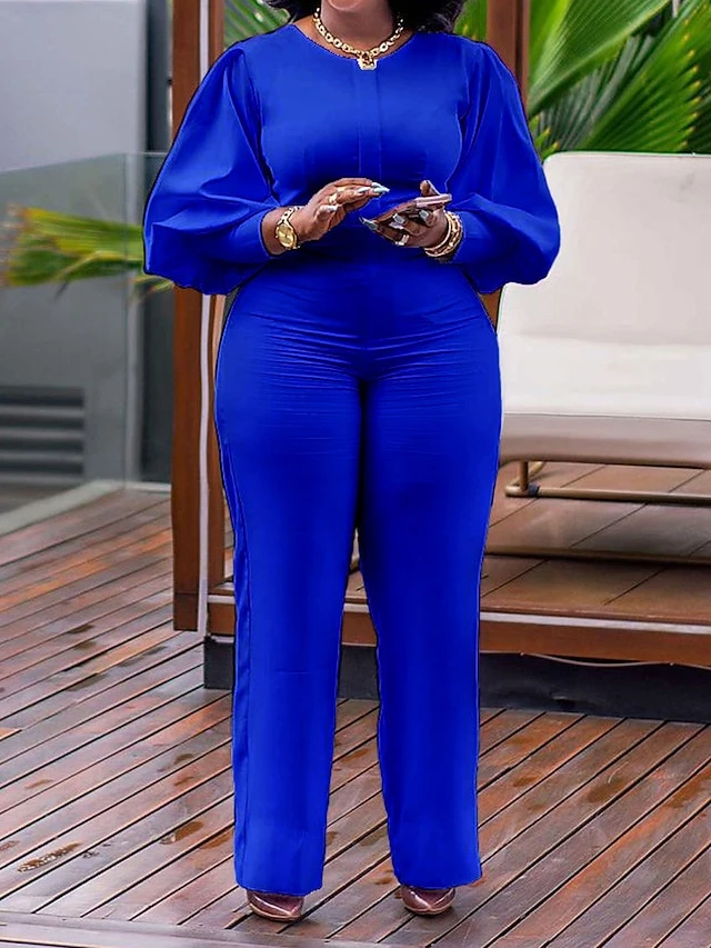 Women’s Jumpsuit High Waist Solid Color Round Neck Active Daily Vacation Wide Leg Slim Long Sleeve Puff Balloon Sleeve Black Pink Blue S M L Fall