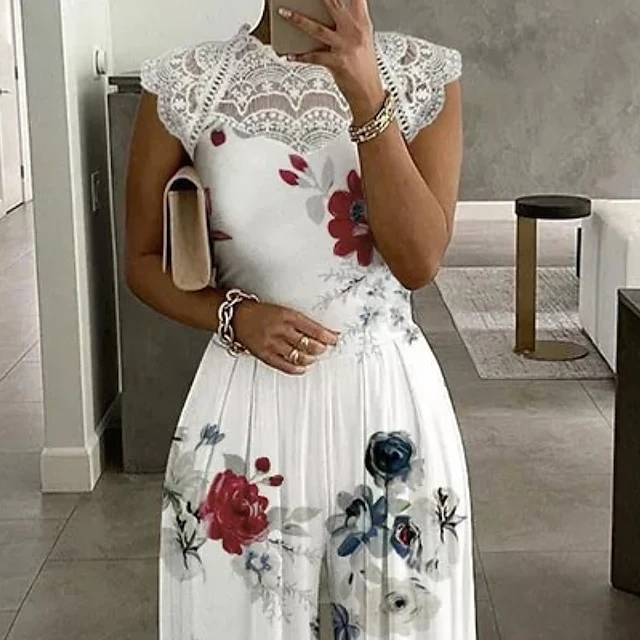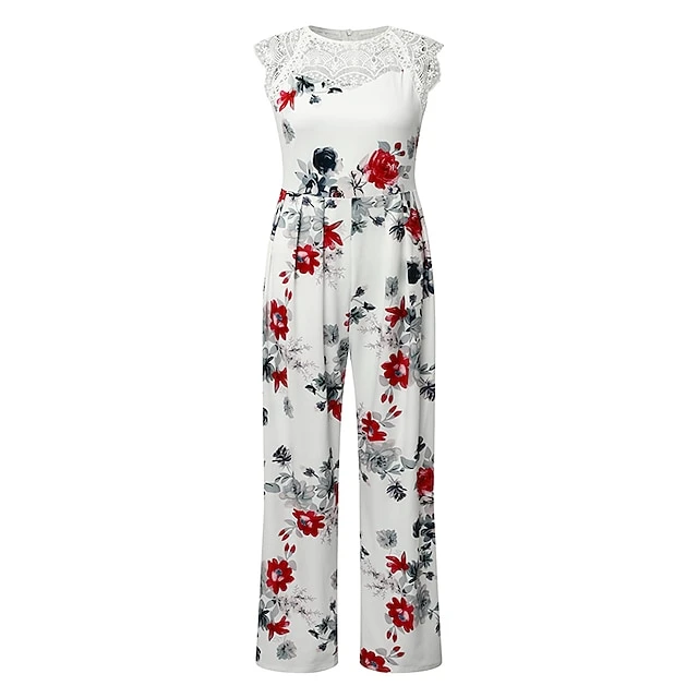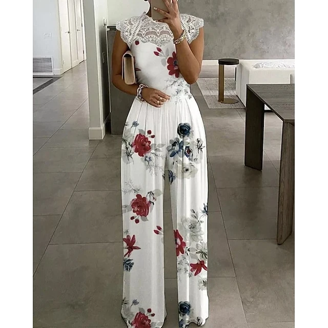 Women’s Jumpsuit Lace Print Floral Crew Neck Elegant Daily Holiday Straight Regular Fit Sleeveless Beige White S M L Spring