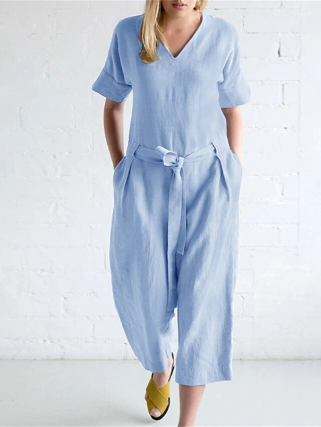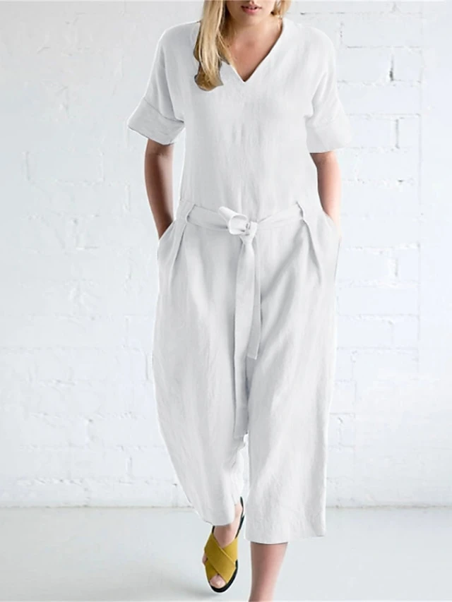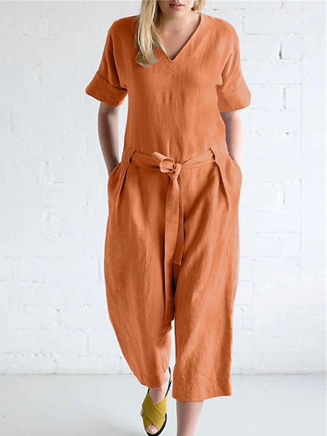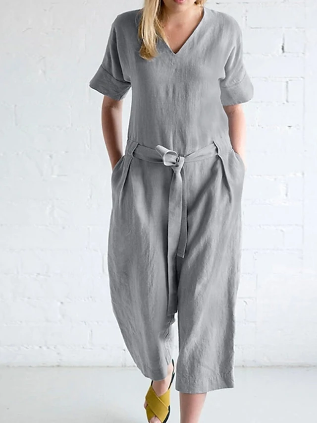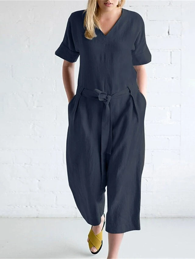 Women’s Jumpsuit Lace Up Patch Pocket Solid Color V Neck Streetwear Street Daily Regular Fit Short Sleeve Black White Navy Blue S M L Summer