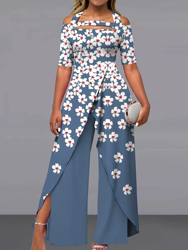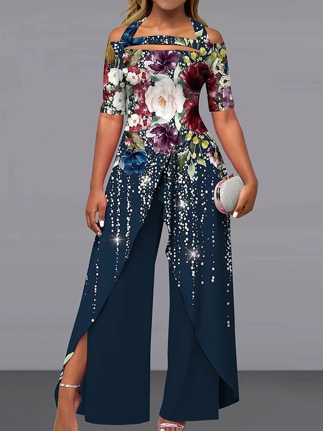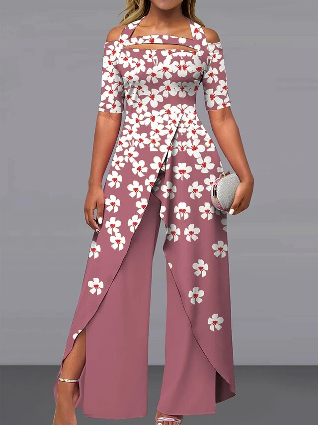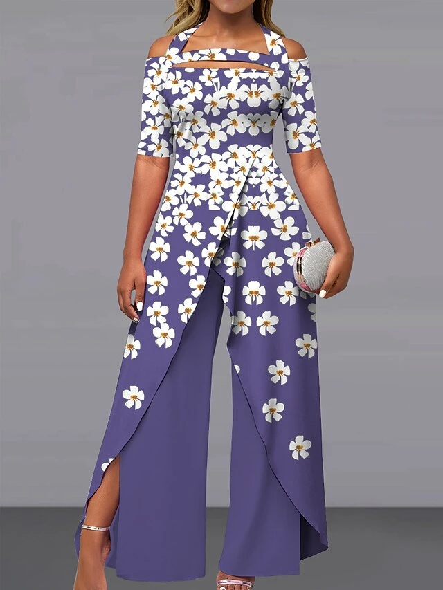 Women’s Jumpsuit Maillard Print Floral Off Shoulder Elegant Party Wide Leg Regular Fit Short Sleeve Pink Navy Blue Royal Blue S M L Summer Fall