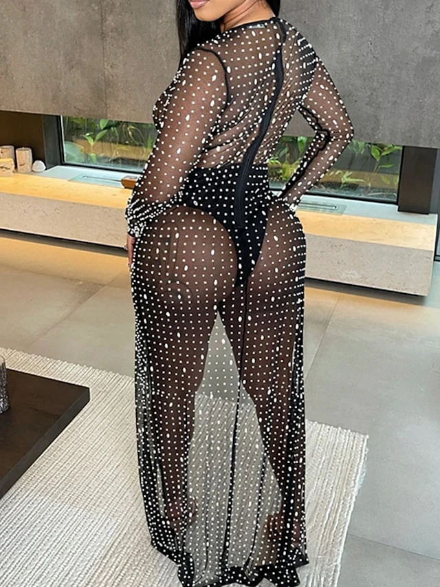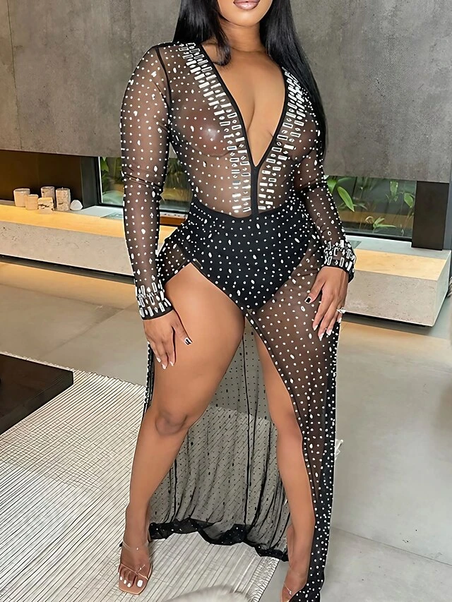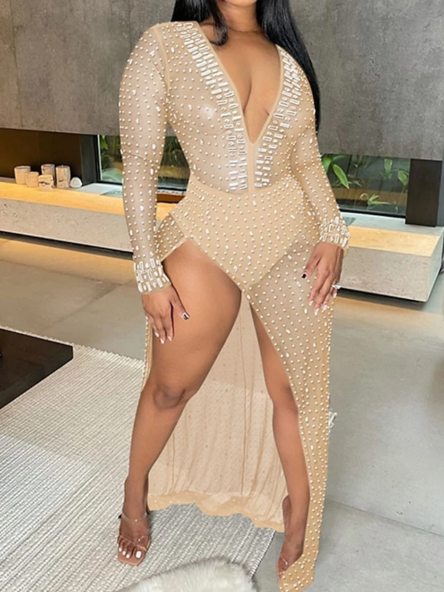 Women’s Jumpsuit Mesh Solid Color Deep V Sexy Party Bar See Through Regular Fit Long Sleeve Red Beige Black S M L Winter Fall