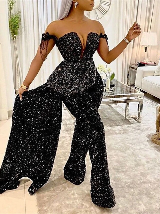 Women‘s Jumpsuit Overlay Sparkly Sequin Solid Color Off Shoulder Wedding Streetwear Party Prom Regular Fit Sleeveless Black S M L Summer Fall