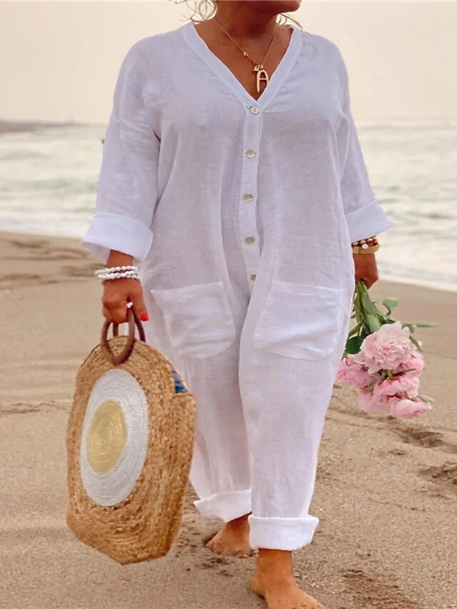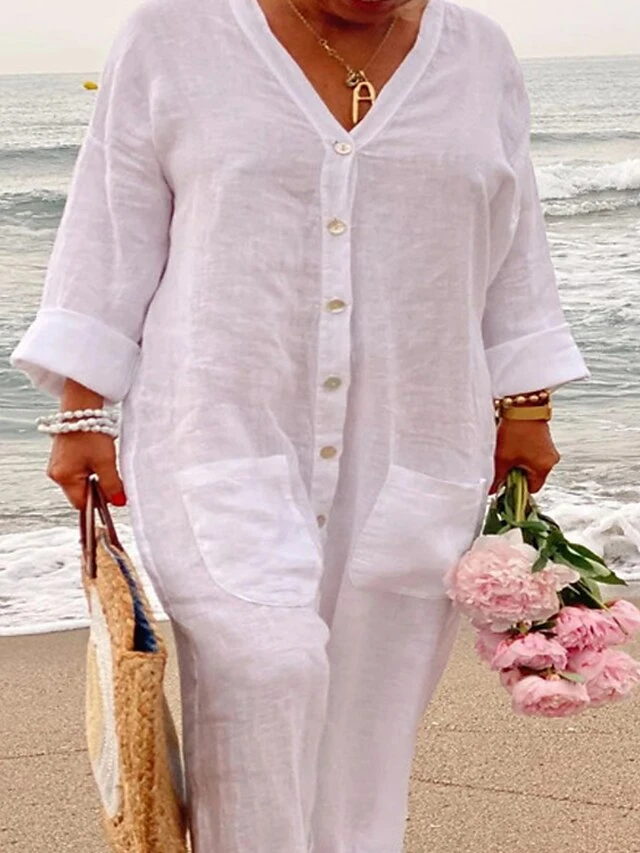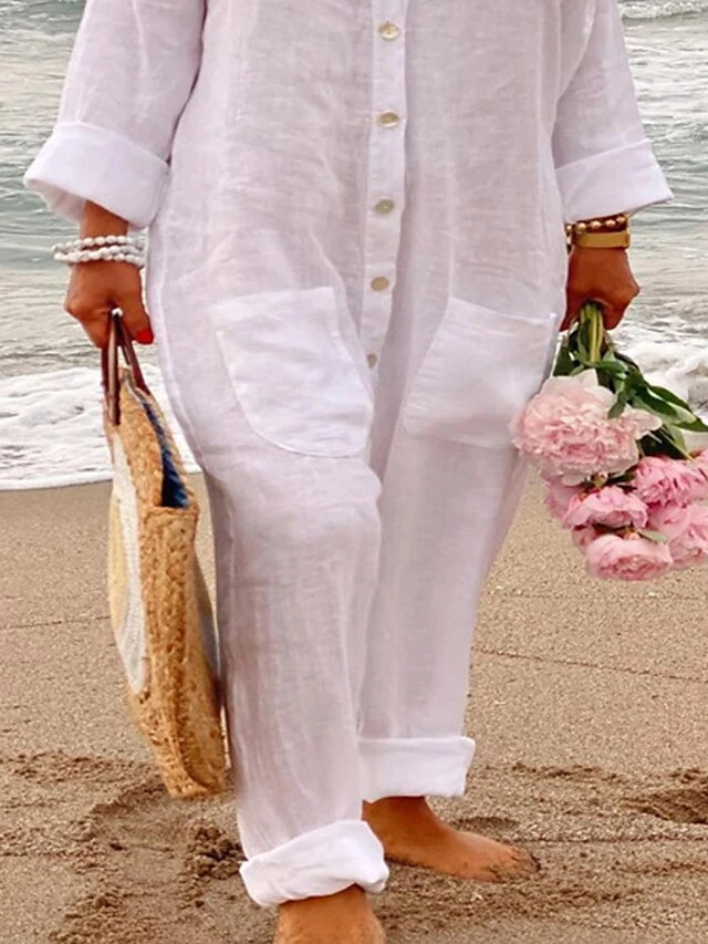 Women’s Jumpsuit Pocket Solid Color V Neck Streetwear Daily Vacation Regular Fit Long Sleeve White S M L Spring