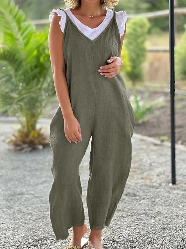Women’s Jumpsuit Pocket Solid Color V Neck Streetwear Street Daily Regular Fit Strap Army Green S M L Summer