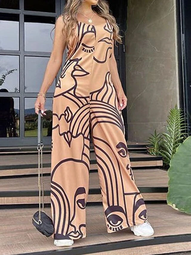 Women’s Jumpsuit Print Abstract Crew Neck Streetwear Daily Vacation Wide Leg Loose Fit Sleeveless Black White Camel S M L Summer