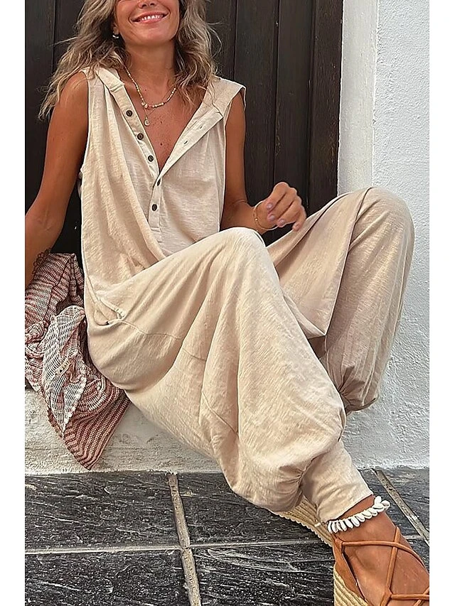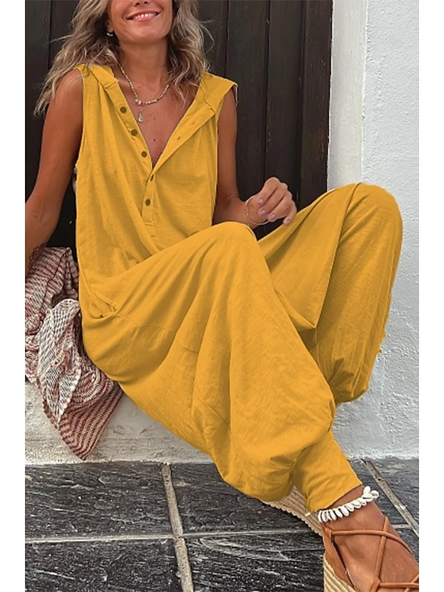 Women’s Jumpsuits Casual Utility Button Solid Color Hooded Streetwear Daily Vacation Regular Fit Sleeveless Black Yellow Purple S M L Summer Fall