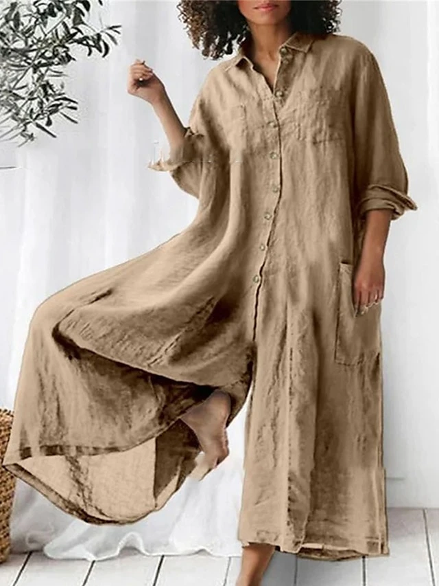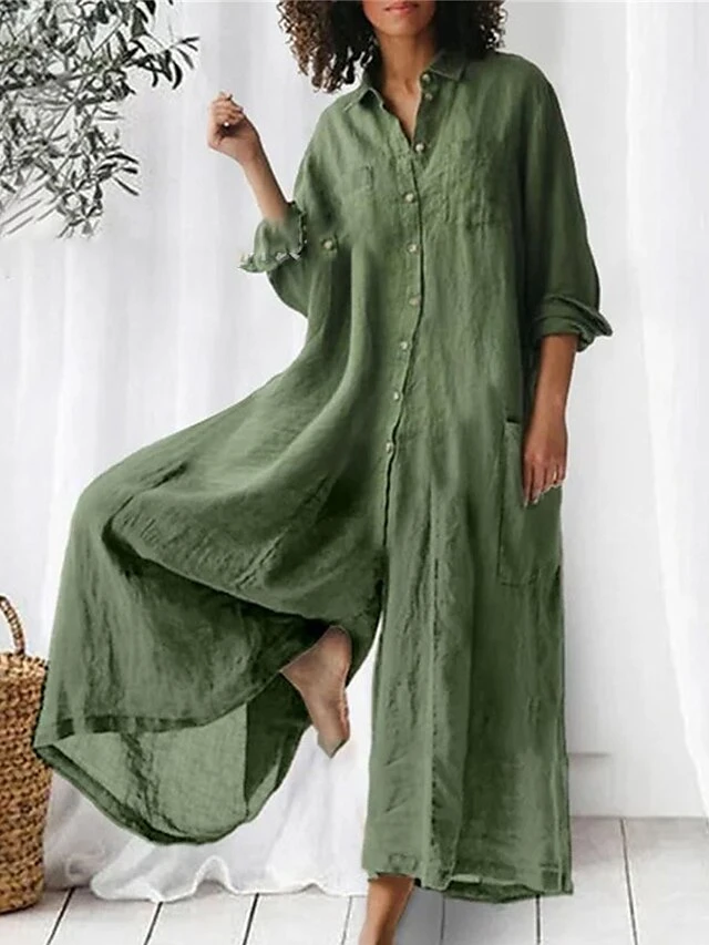 Women’s Jumpsuits CasualFall Button Pocket Solid Color Shirt Collar Streetwear Street Daily Loose Fit Long Sleeve Blue Green Khaki S M L Summer