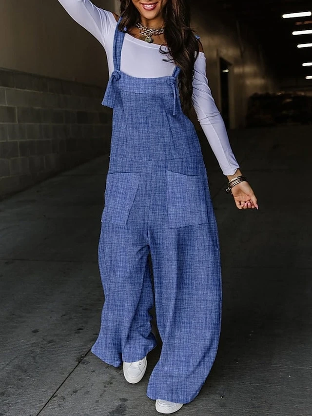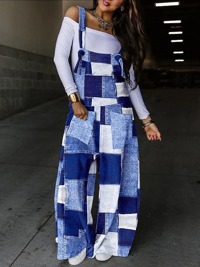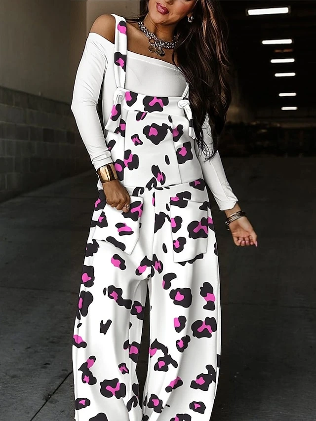 Women’s Overall Print Solid Color Square Neck Casual Street Wide Leg Regular Fit Strap Black White Army Green S M L Fall