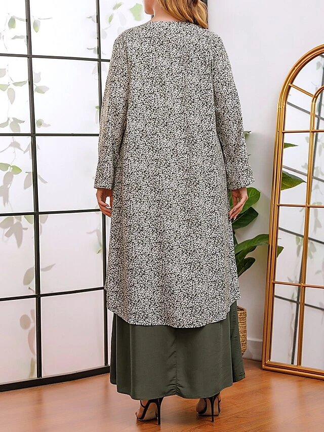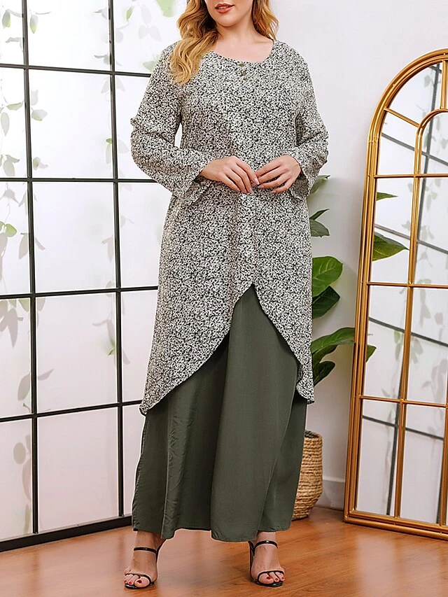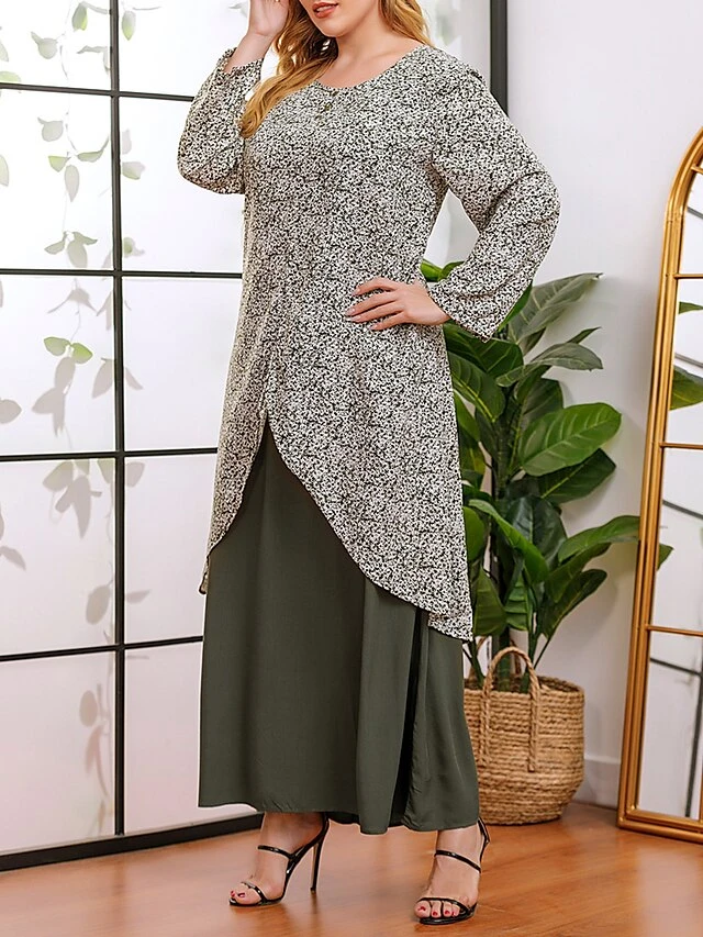 Women’s Plus Size Curve Casual Dress A Line Dress Floral Dress Solid Color Floral Long Dress Maxi Dress Long Sleeve Fake Two Piece Crew Neck Fashion Party Green Fall Winter XL XXL 3XL 4XL