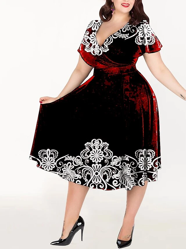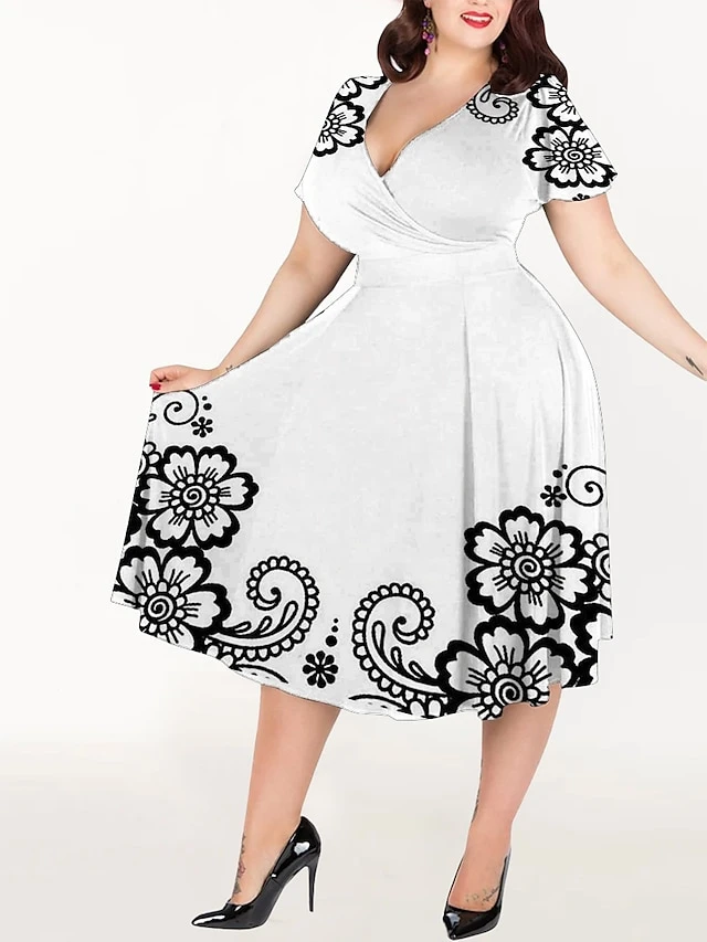 Women‘s Plus Size Curve Casual Dress A Line Dress Graphic Midi Dress Short Sleeve Print V Neck Elegant Holiday Black White Summer Spring L XL XXL 3XL 4XL