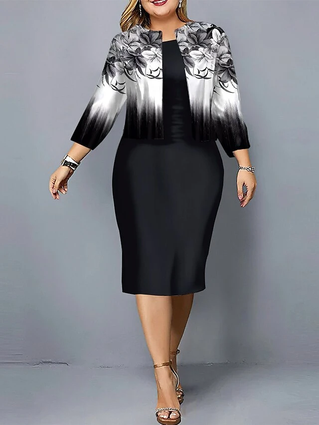 Women’s Plus Size Curve Casual Dress Dress Set Two Piece Dress Floral Gradient Midi Dress Long Sleeve Print Crew Neck Fashion Outdoor Black Red Fall Winter L XL XXL 3XL 4XL