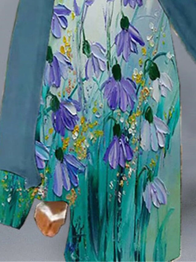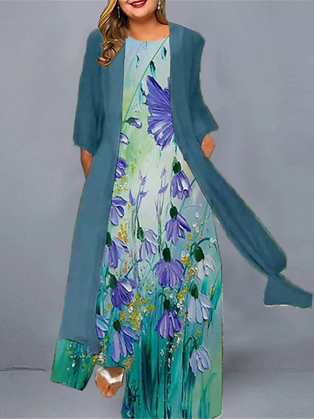 Women‘s Plus Size Curve Casual Dress Dress Set Two Piece Dress Floral Long Dress Maxi Dress 3/4 Length Sleeve Print Crew Neck Fashion Daily Purple Green Spring Summer L XL XXL 3XL 4XL