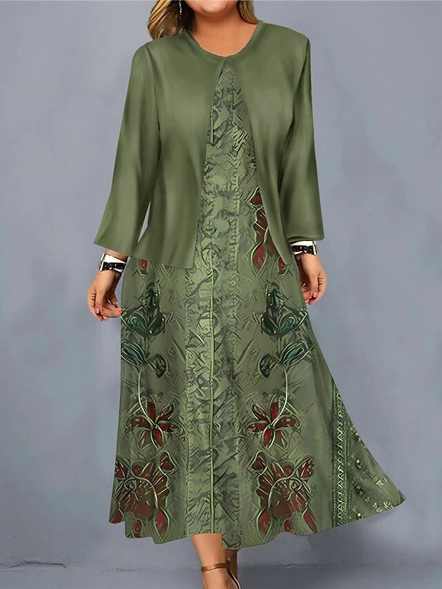 Women’s Plus Size Curve Casual Dress Dress Set Two Piece Dress Floral Midi Dress Long Sleeve Print Crew Neck Fashion Outdoor Blue Purple Fall Winter L XL XXL 3XL 4XL