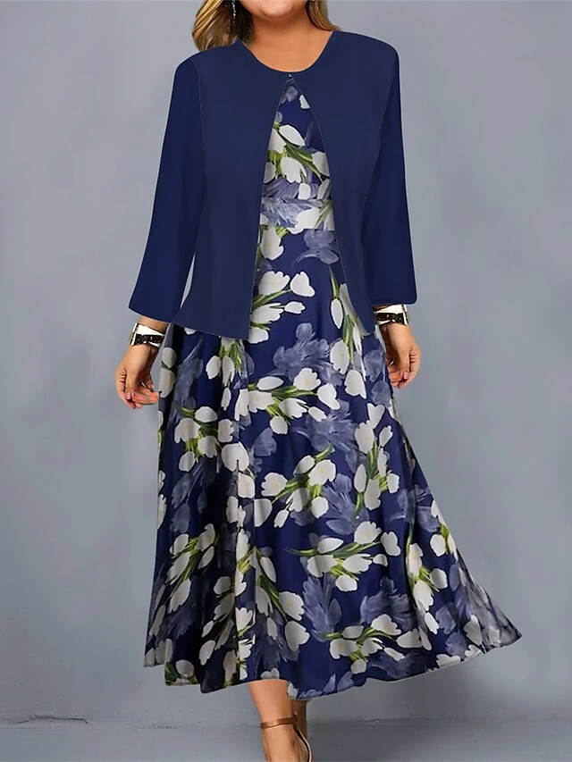 Women’s Plus Size Curve Casual Dress Dress Set Two Piece Dress Floral Midi Dress Long Sleeve Print Crew Neck Mature Outdoor Black Navy Blue Fall Winter L XL XXL 3XL 4XL